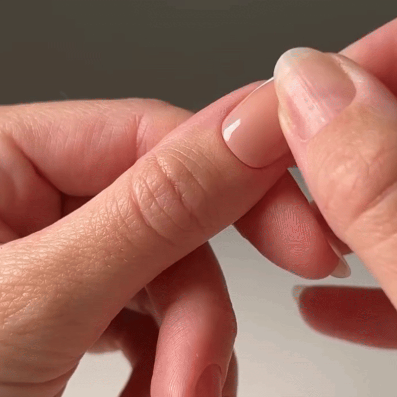 Align the press-on nail slightly above your cuticle at a 45 degree angle, then press it down firmly for 15–30 seconds.Hold and press on the center, then each side, to secure.